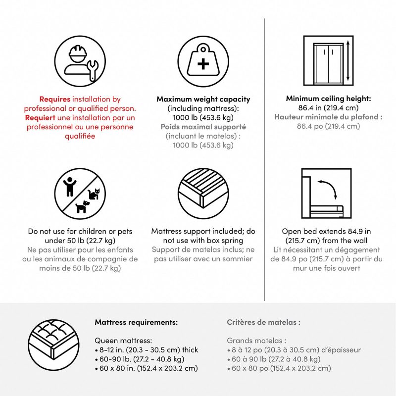 INSTALLATION AND NOTES: To avoid risk of injury, the wall bed must be installed to wall and floor structure by a professional or qualified person. Two people are required for assembly. Installation requires attachment to wood studs or masonry, removal of the baseboard, and drilling into the floor (if disassembly is required, holes may be covered with baseboards 0.5 inches or thicker). All necessary hardware is included. Do not use this product for children or pets under 50 pounds (22.7 kg).